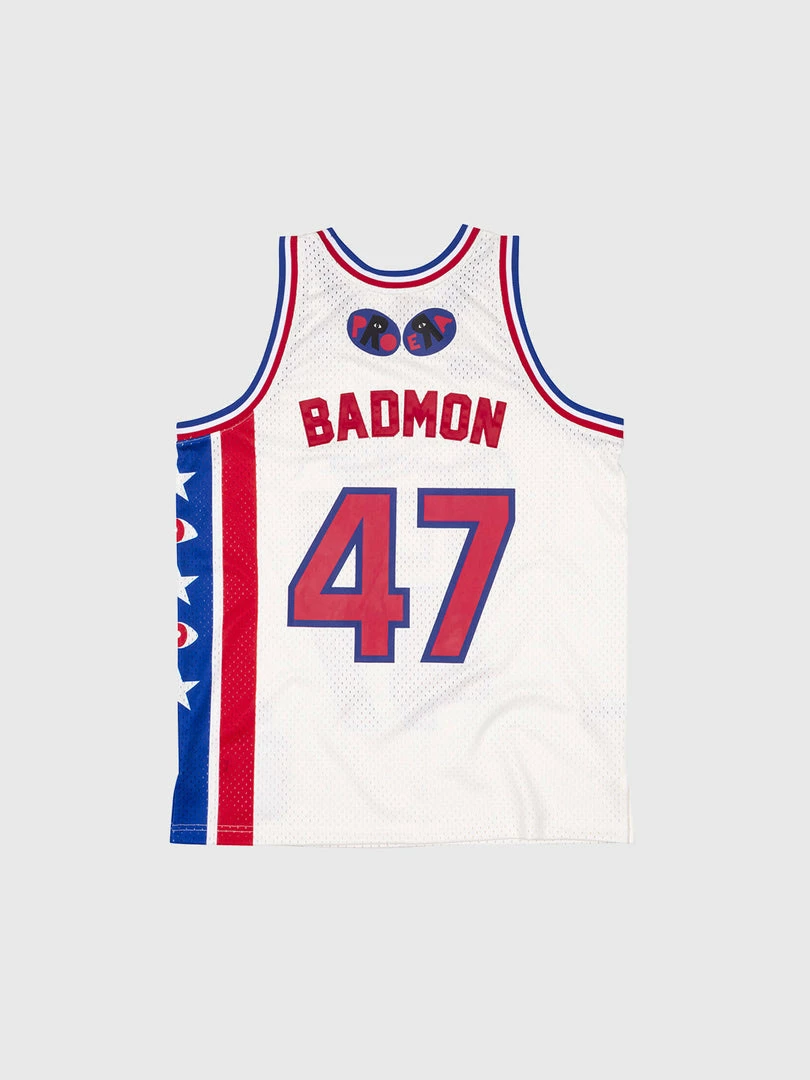 This jersey has a 100% poly mesh body, heavy screen print graphics on front and back, printed tackle twill name on the back, sublimated side print, contrast color ribbing at neck and armholes, embroidered details and a special collaborative woven jocktag.