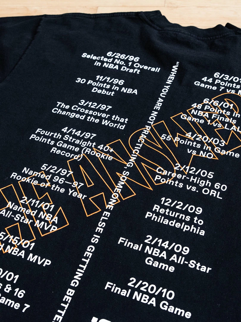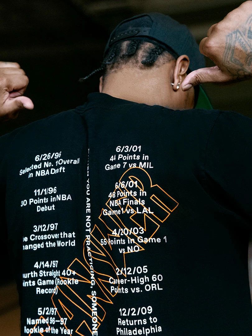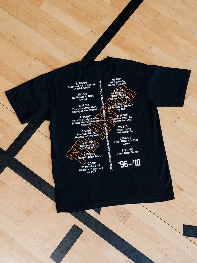 Allen Iverson went No. 1 in the ’96 NBA Draft and changed the game forever. Each “tour date” on this shirt is connected to an iconic moment, achievement or memory from The Answer’s explosive career.