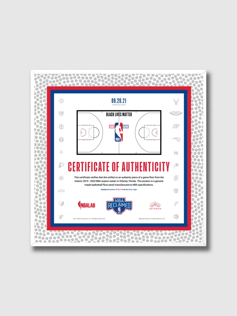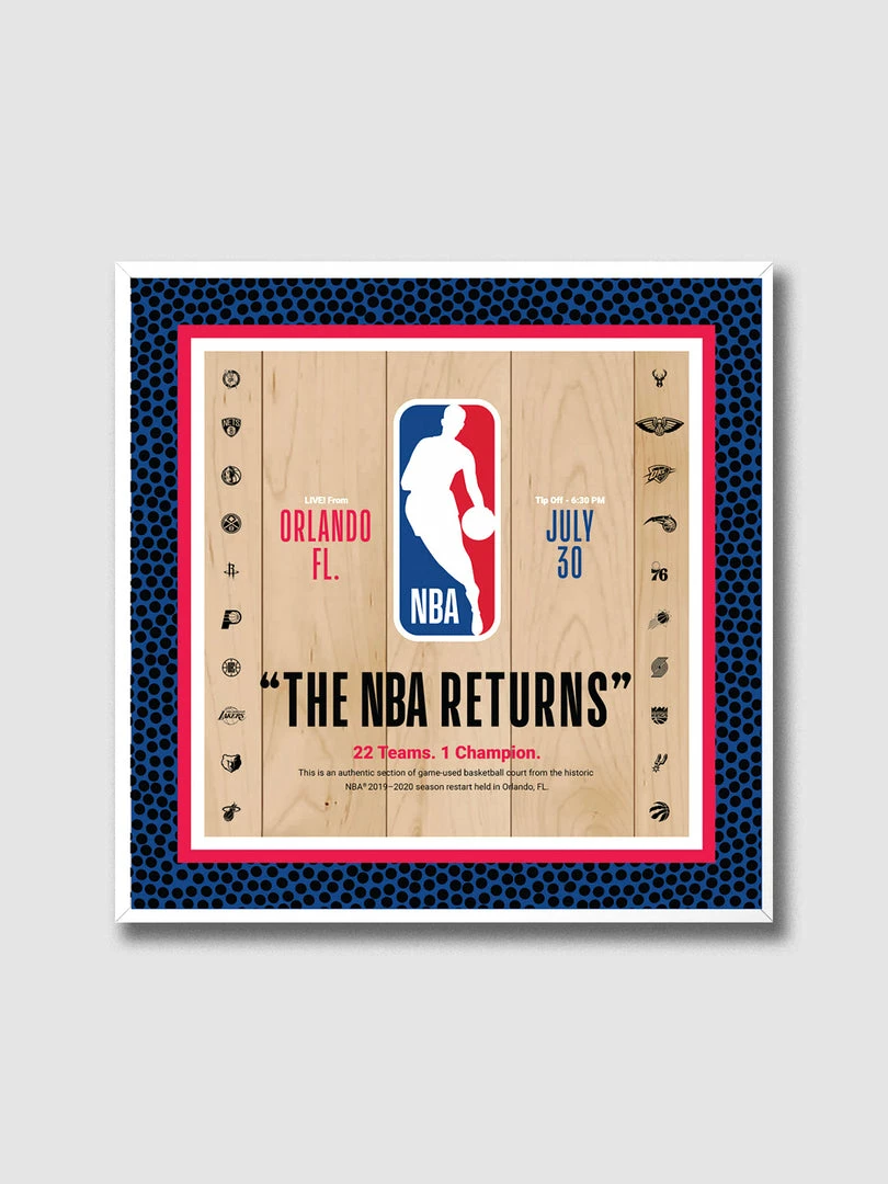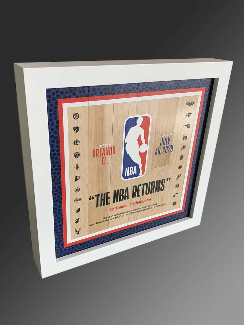 To commemorate the 2019 – 2020 NBA season that was truly like no other, B/R has partnered with NBALAB to reclaim game-used floorboards from one of the three courts used in Orlando, Florida. The framed piece is 13″ x 13″ and features a 12″x 12″ section of game-used NBA floorboard on a wood base panel encased in a white wood frame.